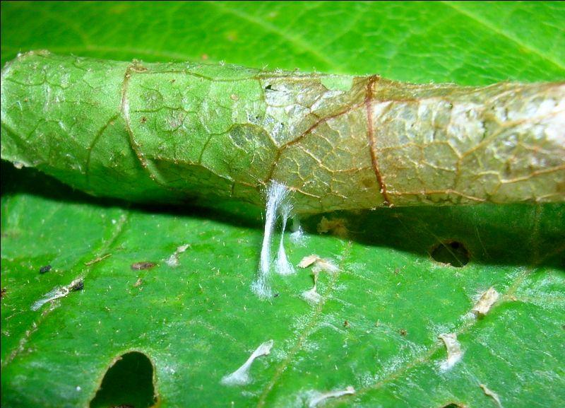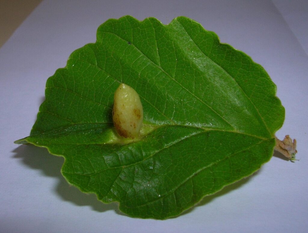 If your soil is drier, you might choose witch-hazel. The seeds are not particularly attractive to birds but there are insects that are out late in the year that use the flowers for nectar and there are quite a few insects that use the leaves during the summer. I have come across two species: the witch-hazel cone gall aphid (Hormaphis hamamelidis) and the three-spotted nola (Nola triquetana). The former makes cone-shaped galls on upper leaf surfaces and the latter is a moth whose larvae make leaf rolls in which to feed and develop. In the rightmost photo below, note the silken strands that hold the roll in place. Also, the tan color on the right side is where the caterpillar has fed on the surface of the leaf.