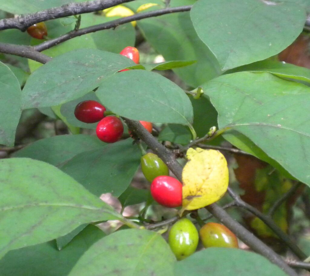 If your soil is moist and fairly rich in humus, spicebush would be your choice. In the summer it is a host plant for the spicebush swallowtail butterfly and the Promethea moth and in the fall it has bright red berries relished by birds. I find the brownish bark especially attractive with its many whitish lenticels that serve for gas exchange. Make a tiny scratch on the bark of a twig, rub your finger over it and get a whiff of the wonderfully aromatic smell on your finger. I can no more pass a spicebush without doing that as I can pass by a milkweed without looking for monarch eggs or caterpillars.